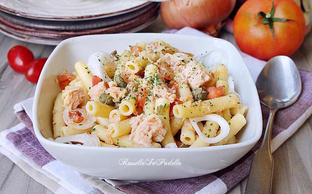 Ingredienti: 440 g. pasta (meglio se corta) – 1cipolla – 240 g. di tonno sott’ olio – 2 pomodori insalatari – 3 cucchiai di capperi – 4 acciughe sott’olio – origano – peperoncino – prezzemolo – olio extravergine d’ oliva
