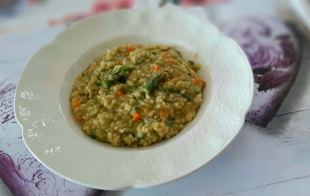 Successivamente aggiungere qualche mestolo di brodo e continuare ad aggiungere il brodo per 20 minuti. Gli ultimi 5 minuti aggiungere la crema di asparagi.